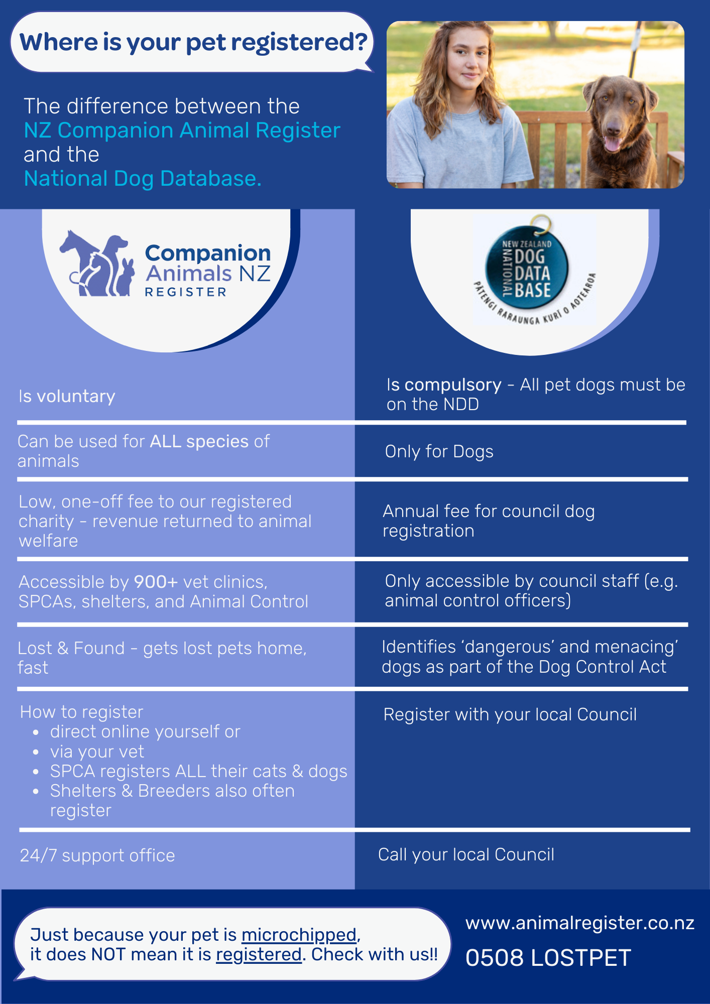 The NDD is compulsory and was set up to monitor the whereabouts of dangerous and menacing dogs. The NZCAR is voluntary and widely recommended by vets and rescues as the leading lost and found database.