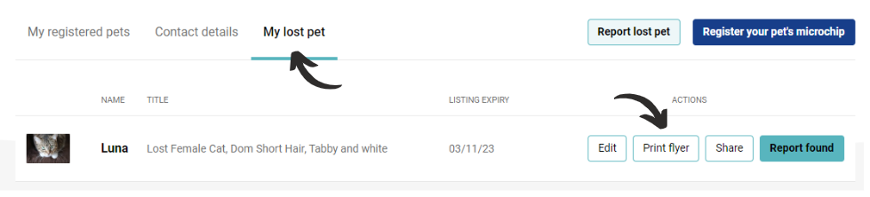 Log into your account where you will automatically arrive on your 'My lost pet' tab. Click 'Print flyer'. You can preview the flyer prior to printing