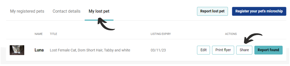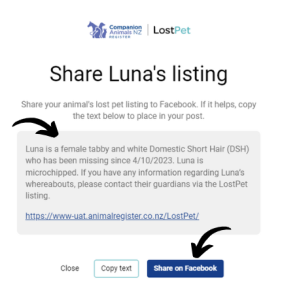 Log into your account where you will automatically arrive on your 'My lost pet' tab. Click 'Share'. You will be presented with some optional text which you are able to copy, then paste to your post.