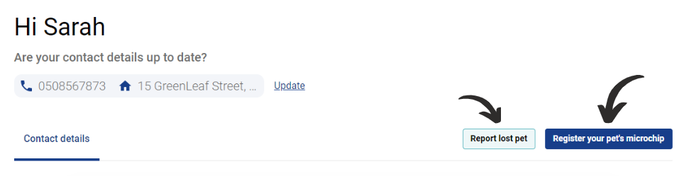 Once your contact details are saved, you'll be taken to your dashboard. All of your registered pets should be displayed here. If one of your animals is not displayed, contact us quoting their microchip number and our support team can help to resolve this for you.