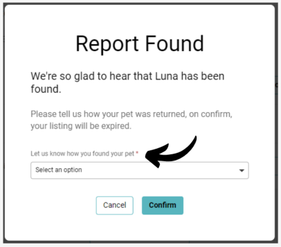 When you report your animal as found, you will be asked how your animal has returned to you. This new feature will allow us to learn more about how animals are making their way home and help us to improve our service to get more pets home faster!