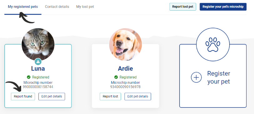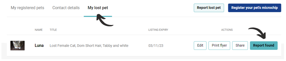 Log into your account where you will automatically arrive on your 'My lost pet' tab. Click 'Report found'. You will be asked how your pet was reunited with you and have the option of adding further detail.