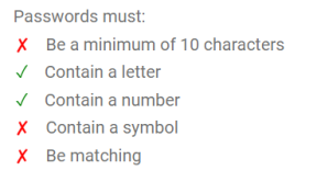 Image below of password requirements as they are included (the 'x' will become a 'tick' once they have been included in your password)