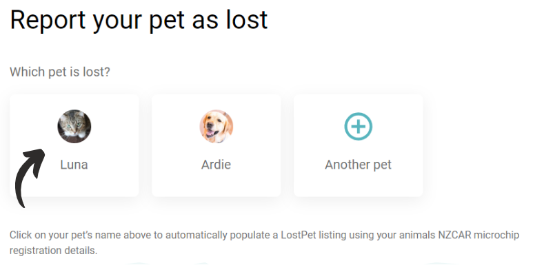 If your pet is already registered on the NZCAR, click onto their name/photo. This will automatically populate your lost pet listing with their existing NZCAR registration details.